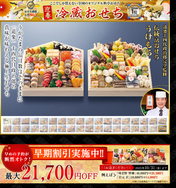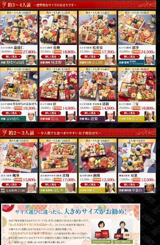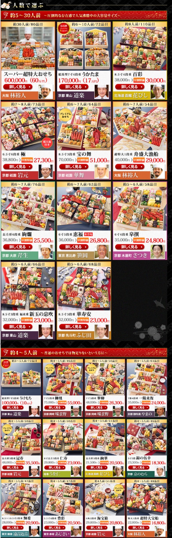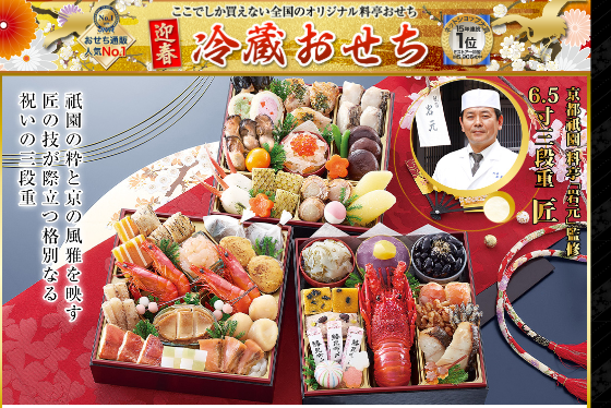 このサイトでは、自社グループの人気料亭2店と高級レストラン1店のシェフが監修した、独創性と一流の技術が詰まった6種類のおせち料理を提供しています。